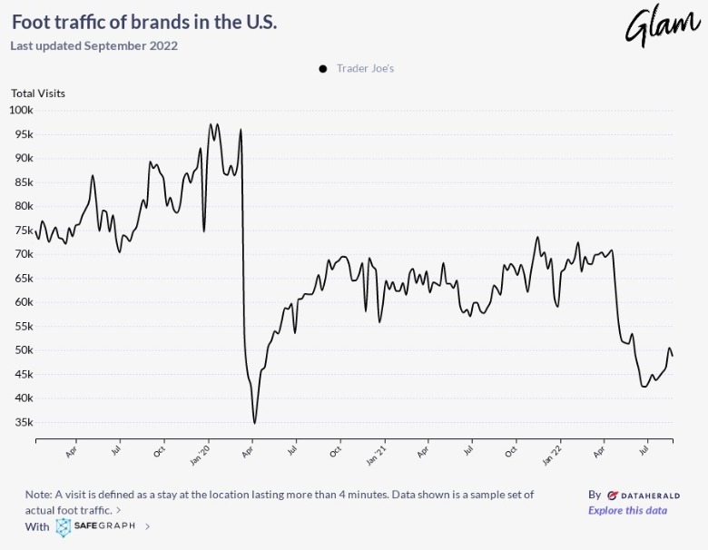 With average monthly foot traffic of between 75,000 and 85,000 unique visits, Trader Joe's did remarkably well before the COVID-19 pandemic, as seen in data collected by SafeGraph. Between January and March of 2020, the retailer received over 95,000 visitors a month. However, when the pandemic hit the U.S. in April 2020, traffic drastically decreased. Foot traffic at Trader Joe's began to gradually increase in 2021, averaging 65,000 visits each month. Throughout the first quarter of 2022, Trader Joe's appeared to be on course to reach pre-pandemic level of monthly foot traffic. Surprisingly, in May, foot traffic at the chain plummeted to about 55,000 visits, a significant decrease versus 2021. The number continued to decline in July, reaching roughly 45,000 visits. In August, Trader Joe's foot traffic was barely over 50,000 visits.