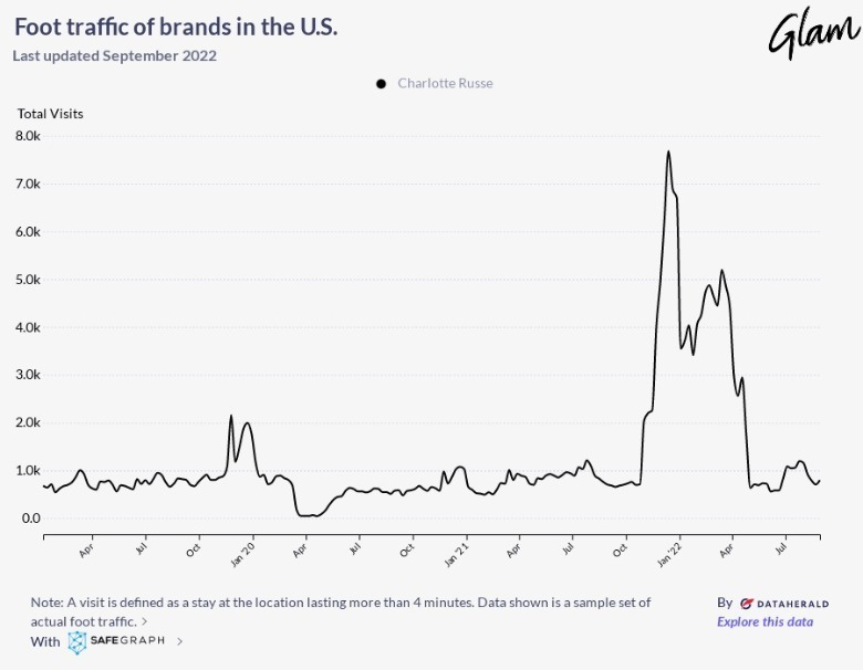 According to SafeGraph data, Charlotte Russe's typical foot traffic averaged between 1,000 and 2,000 unique visits per month until the pandemic reached the United States in March 2020, dropping its numbers drastically. Charlotte Russe's foot traffic eventually hit 1,000 once more in December 2020 and January 2021, during the bustling holiday season. For most of 2021, the retailer's monthly in-store traffic averaged about 1,000 visits. During 2021's holiday season, however, Charlotte Russe's foot traffic skyrocketed to 8,000 visits, an increase of eight times more than the same period in 2021. However, in-store traffic fell to 3,000 visits in April, followed by a persistent, rapid decline to 1,000 again in the summer. But what gives?