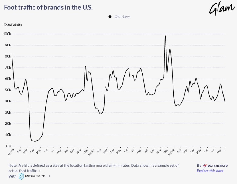 As seen in data collected by SafeGraph, pre-pandemic foot traffic at Old Navy averaged 65,000 unique visits per month. When the U.S. was put under a national emergency in March 2020, Old Navy's foot traffic plummeted to below 10,000. In June of the same year, the retailer's foot traffic bounced back to 50,000, before peaking at 70,000 during the holiday season. Old Navy's in-store traffic decreased to 30,000 in February 2021, the sluggish month for retail due to the post-holiday lull. Due to the holiday shopping season, the retailer's traffic peaked in November and December 2021 at close to 100,000. Fast forward to 2022 and Old Navy has witnessed a monthly average of 50,500 visitors. Although these numbers are not particularly outstanding, it is remarkable that Old Navy has managed to retain in-store visitors despite the post-pandemic economic crisis.