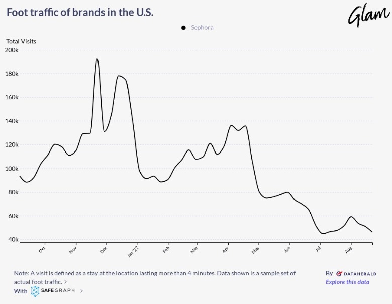 Recent traffic metrics from SafeGraph seem to foretell the toppling of a beauty giant as mall landscapes lose their hold on consumers and Sephora's storefronts fail to draw in crowds. In the first week of September 2021, Sephora managed to report 93,785 daily visitors. But one year later, the numbers for 2022 show a sobering decline. On August 22, Sephora only had 46,165 in-store visitors, marking a nearly 51% decrease in slightly less than 12 months. In essence, its traffic has been slashed in half. But why?