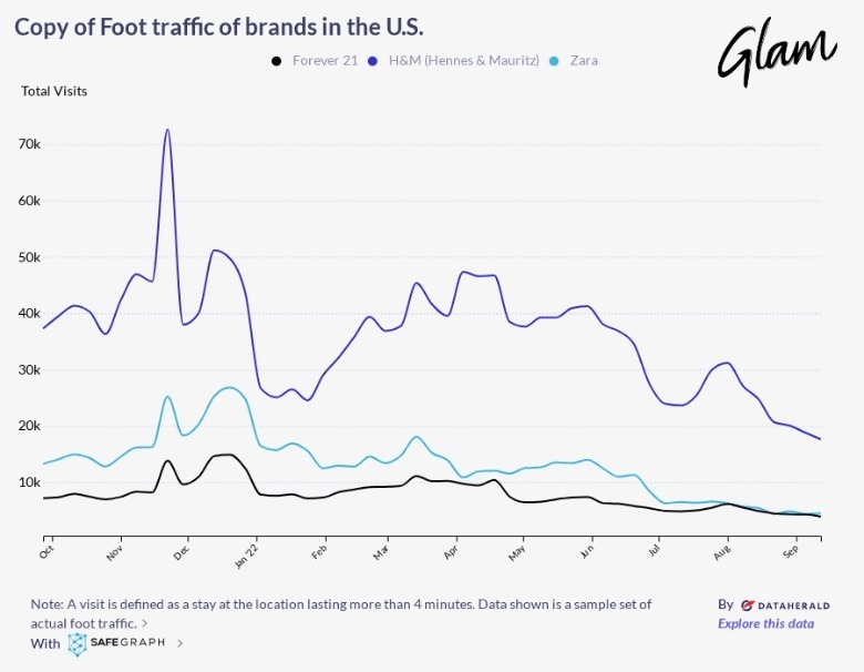 H&M appears to be the most well-liked fast fashion retailer in terms of foot traffic, per data collected by SafeGraph. H&M averaged 52,000 monthly visits from October to December 2021, followed by Zara with 19,600 and Forever21 with 10,600. During the holiday season, over 70,000 people visited H&M. From January to June 2022, H&M had an average monthly foot traffic of about 38,000 visits. Meanwhile, both Zara and Forever21 had a progressive slide, with average monthly visits of 13,500 and 9,000, respectively. In July, a historically slow month for retail since people are busy saving for the year-end holidays, all three companies hit their lowest marks. From August until October, however, all three retailers have continued seeing a steady decline in their in-store shoppers.