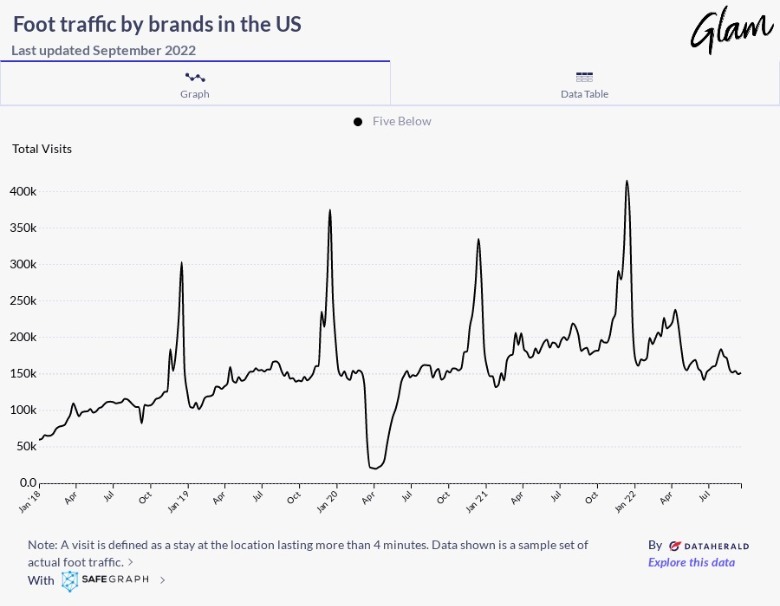 Of course, Five Below suffered low foot traffic scores during COVID-19-induced lockdowns, pulling in only 20,068 in-store shoppers at the end of March 2020. But that didn't stop the retailer from rebounding quickly. One day in mid-September 2021, Five Below brought in 175,606 customers — an even higher foot traffic score than in pre-pandemic times. Fast-forward to mid-September 2022 and the retailer received 150,813 visits, proving that the company is doing just as well as ever. So, how is Five Below pulling in so many people?