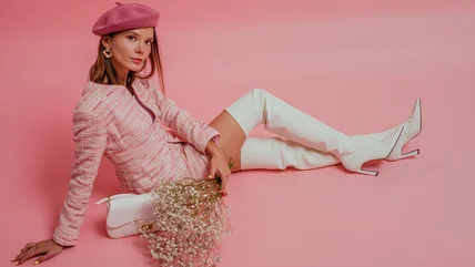 But if you prefer baggier jeans, which have been in style throughout the 2020s, you can easily pair the already-trendy garments with over-the-knee boots. Just let the jeans fall over the boots, as TikToker @itstaylareese did in a video in which she flaunted her stylish work outfit featuring baggy jeans over pink-ish boots.