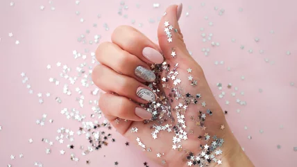 First, choose a neutral color, then top it with silver glitter polish, making sure to add more glitter to the tip of your nails and blend it down toward your cuticles.