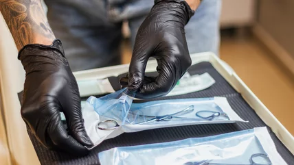 The shop should be clean, and all equipment used for piercing should be removed from their packaging or removed from a special sterilization device called an autoclave in front of the customer. Piercers should wash their hands before they put on disposable gloves and change them every time they touch something non-sterile. Each piercing station should contain a sharps container, and all needles should be properly disposed of after every piercing.