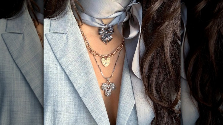 Ribbon bow motifs don't have to be silver or gold to be trendy. Bright and colorful bows are another way to add a statement to classic jewelry pieces. Designer Susan Alexandra specializes in colorful, beaded bags and accessories. Her namesake brand shared this Instagram post featuring a classic necklace donned in colorful bow charms along with matching colorful bow drop earrings.