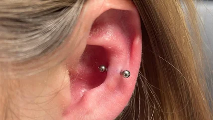 According to pro piercer Sara of Brilliance Bay, "'Faux Snug Piercing' is [a] great alternative to the conventional Snug. It is basically two separate piercings: a conch piercing positioned parallel with an outer helix piercing, to give the illusion of a regular Snug. Both piercings can also be styled differently to give this piercing a lot more versatility with jewelry than a conventional Snug (which can only wear a curved barbell)." Who doesn't love a workaround?