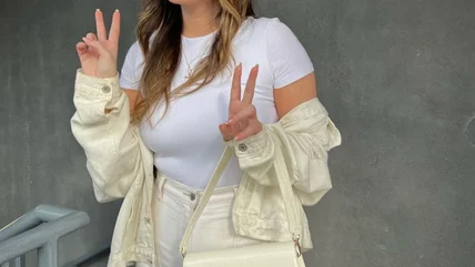 You know the weather is getting warmer when the white jeans come out! White jeans are back in style this year (did they ever really go out?), and we love how this model has styled hers. A basic white tank pairs perfectly with these jeans for a classic summer look. The chunky cream cardigan is the perfect accessory for this cool girl aesthetic.
