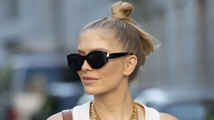 If you choose a very sleek flip bun, adding accessories gives the modern look a dose of maximalism. And if you're up for a challenge, you can create one smaller bun at the top, and keep a second bun or ponytail hidden under the remaining untied hair for a sculptural aesthetic. While ties are used to accentuate this style (in an almost literal strapped ponytail), you can always add barrettes to complete the look.