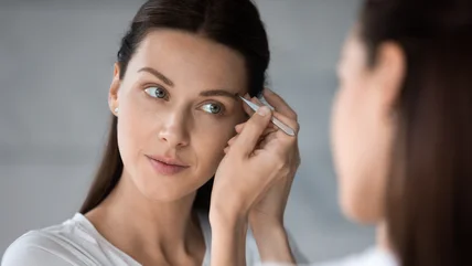 If your brows could use some grooming, start by brushing brows upward with an eyebrow brush or spoolie brush. Next, carefully trim above the brow line with your eyebrow scissors. Remember, less is more when trimming brows. Now, pluck strays from between brows, at ends of brows, and under arches. One rule of thumb when it comes to plucking: Only remove hairs on the top side of the brow, as taking too many hairs above the brow can leave you with an unnatural eyebrow shape.