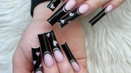 3D nail appliques remain all the rage, and these pearls are some of the best examples out there. Adding pearls to your manicure makes for a beautiful and elegant look. Coupled with the black tip of a French moon, there's something almost mysterious about this style that will surely draw the eyes of all around you. Tone down this look by removing the glossy top coat and go for a more matte style on the base.