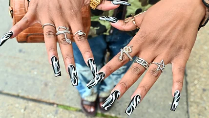 Although you don't need a tuxedo design to get the tuxedo nails trend, it's definitely one way you can rock this trend. Add black nail polish with white dots on top for a sophisticated and chic nail design. This nail design can be as literal or customized as you want. Mix up the colors around for inverse pairings that will create another visual interest. Once you've got your nails suited up, they'll be ready to hit the next red carpet.