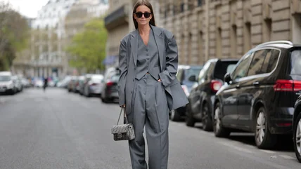 While the mention of a gray suit may conjure images of drab business lunches, try an oversized gray suit styled in a more relaxed fashion. A gray with pink or purple undertones will have a vibrant ambiance. You can skip the undershirt, and wear an oversized blazer as the top. Or instead of typical dressy shoes, pair the suit with classic white sneakers – it's unexpected and on-trend.