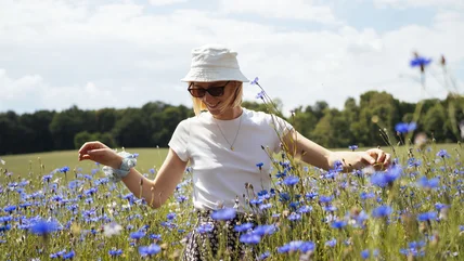 If your style this summer is giving no-nonsense, simple, yet still playful vibes, we have the perfect bucket hat for you. Find a bucket hat in a summery pastel color that sports a single flower on the front. If you want a bit more of a pattern, one that has a print of several small, dainty flowers can achieve the same effect.