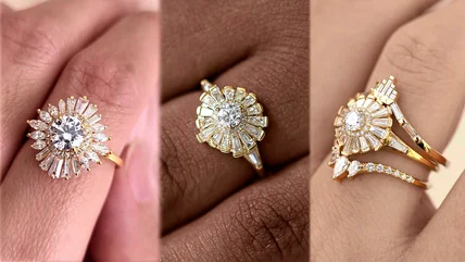 The baguette halo trend has recently become more prevalent thanks to its Art Deco design. With many seeking a ring with a vintage and timeless design, it's no secret that the Art Deco design is perfect for those looking for something unique that will remain classic for many years to come. Adding to the Art Deco design is the concept of gold metal bands or vintage gold. This glistening detail will help make your ring stand out and seem even more glamorous.