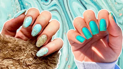 It's fun to rock nails that aren't all perfectly matching. Banish boring nails with a mismatched mani by going for this Tiffany blue set, which includes diagonally painted nails on the pointer and middle finger. Even though the other three fingers are painted solidly, these nails are far from boring or basic.