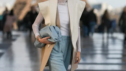Clutching your chic huggie against a unique blouse like the one pictured above makes this look all the more desirable. If you'd prefer to aim for a more monochromatic look, choose a huggie in a similar tone, and don't forget to add dainty, minimalist jewelry for an added touch of whimsy.