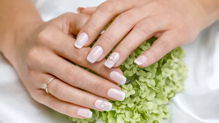 There are plenty of ways to add some color to bridal nails, while keeping the overall look subtle (you don't want it to take too much attention from your dress, after all!). One way is with milk bath nails, which provide a pretty base for almost any design. Choose a pearlescent pinky color to make them more striking. Then, add floral accents. You can even opt for dried flowers for a vintage-inspired look. Choose colorful flowers or stick with shades of white for a more traditional appearance.