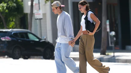 Hailey Bieber dons the perfect weekend coffee-run attire, which comprises pale denim jeans, a white crop top, and a comfy bomber jacket. Together, these basic pieces amount to a trendy city girl look. However, it's the slim sunglasses and vivid red sneakers that stand out for us here, as they help add some personality to an otherwise basic look.