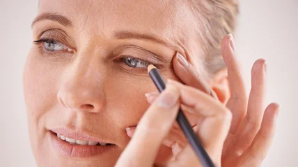 For a winged look, try a powdery eyeliner pencil instead of a liquid liner. These tend to look softer and are more forgiving on older eyes. If you have hooded lids, I suggest drawing the ends first. While your eyes are open and looking straight into the mirror, create a slight line at an upward angle. When you're happy with the result, finish lining the rest of your upper lids. To create a sharp wing, clean up the outer edges with a bit of concealer, but keep the top part slightly smudged so that you end up with a beautiful gradient effect.
