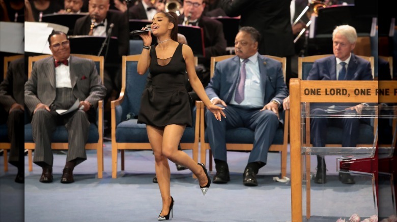 If there's one person with the vocal chops to have given Aretha Franklin the send-off she deserved, it was Ariana Grande. The "Wicked: For Good" star didn't disappoint with her rendition of "(You Make Me Feel Like) A Natural Woman" at Franklin's 2018 funeral in Detroit, Michigan, giving the crowd chills with her belting. But unfortunately, her outfit overshadowed even her amazing singing, and onlookers took to social media to express their outrage over what she was wearing. The outfit in question? A figure-hugging black minidress with a bubble skirt and a sheer panel to make up for the low neckline. Grande complemented the sexy look with accessories that screamed "rockstar" rather than "rest in peace," including a silver choker necklace and metallic pointy-toed sky-high stilettos.
