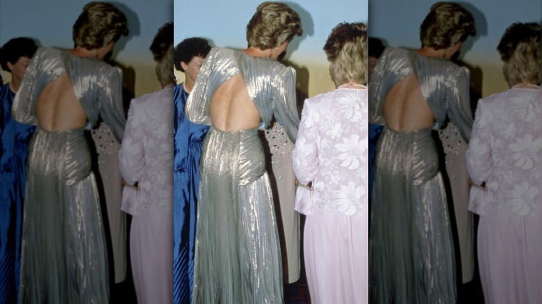 In November 1985, Diana wowed crowds at the "Burke and Wills" film premiere in Melbourne, Australia, with an iridescent silver dress complete with '80s power shoulder pads. But the real drawing card was the back of the dress, most of which didn't actually exist. The silhouette criss-crossed from behind her neck, leaving the majority of her back exposed. Then, from the waist down, the material came together again, the snug fit hidden by an elegant train. When you compare this to her earlier smocks and polka dots, it seems like an incredibly gutsy choice, especially when you consider that the dress was by British designer Bruce Oldfield. Being on a tour of Australia, royal tradition dictates that Diana should've gone with an Australian designer to honor the country she was visiting. This move makes the outfit more inappropriate than the lack of a back does. In fact, this wasn't the only time that Diana decided to toy with backless dresses.