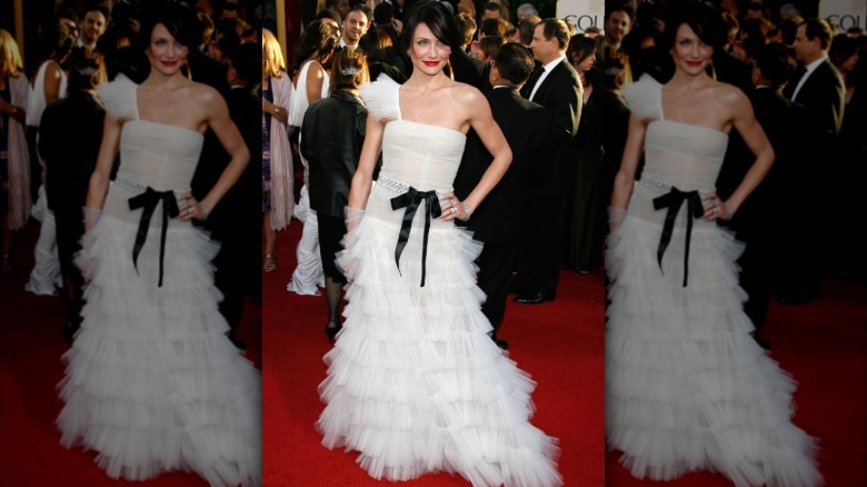 The "Charlie's Angels" star showed up at the 2007 Golden Globes red carpet in an off-white Valentino gown with tiered ruffles and one strap. The dress was princess-like and delicate, but Diaz perfectly balanced it with the addition of the bedazzled belt, black bow, and her at-the-time black hair. Of course, the actor has been known for her blond locks for most of her career, which is why the dark hair color seems like an even more dramatic statement. Now, let's get into the juicy stuff — how come this particular look qualifies as a revenge dress? Because she wore it just after splitting with one of her most famous exes: Justin Timberlake.