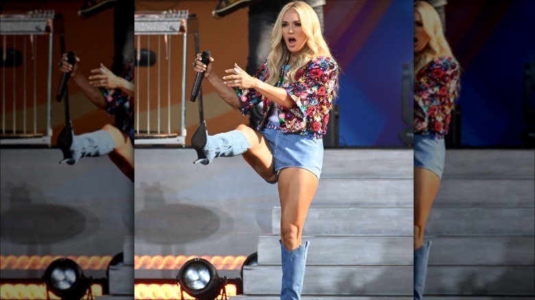 To promote the release of her album "Denim and Rhinestones," Carrie Underwood visited "Good Morning America" in August 2024 wearing an outfit that paid tribute to the album title. She took to the stage in Central Park to perform her hit "Last Name" in an outfit that landed on the list of Underwood's most inappropriate outfits yet. The look in question featured a rhinestone jacket, white top, denim short-shorts with colorful rhinestone belt, and denim boots with silver-capped toes. And people had thoughts.