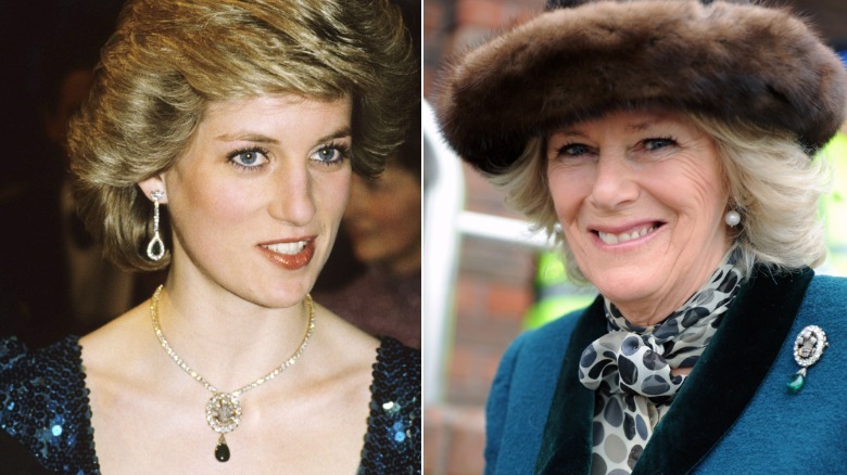 Many royal watchers will forever pit King Charles' wives against each other. First wife Princess Diana will forever remain "the people's princess" whose time was cut short when she perished in Paris in 1997; Queen Camilla will forever be the other woman that has had to work hard to redeem herself in the public eye. Though she's made strides, there are moments that haven't helped, like Camilla Parker Bowles' inappropriate outfit at Diana's wedding that still has people talking or how she wore one of Princess Diana's necklaces as a brooch. Looking at then-and-now pics, we can see how Camilla took the diamond and emerald necklace from its original design, as seen on Diana in Vienna in 1986, and wore it to the Cheltenham races in 2012 as a brooch.