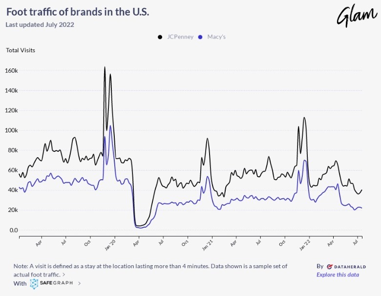 According to data collected by SafeGraph, JCPenney and Macy's both hit all-time high foot traffic scores in the U.S. during winter 2019, just before the COVID-19 pandemic. Then, their foot traffic numbers understandably suffered a massive decline during initial lockdowns in April 2020. Now that over two years have passed, both department stores haven't been able to get as many visits as they did during pre-COVID life. But why is this happening?
