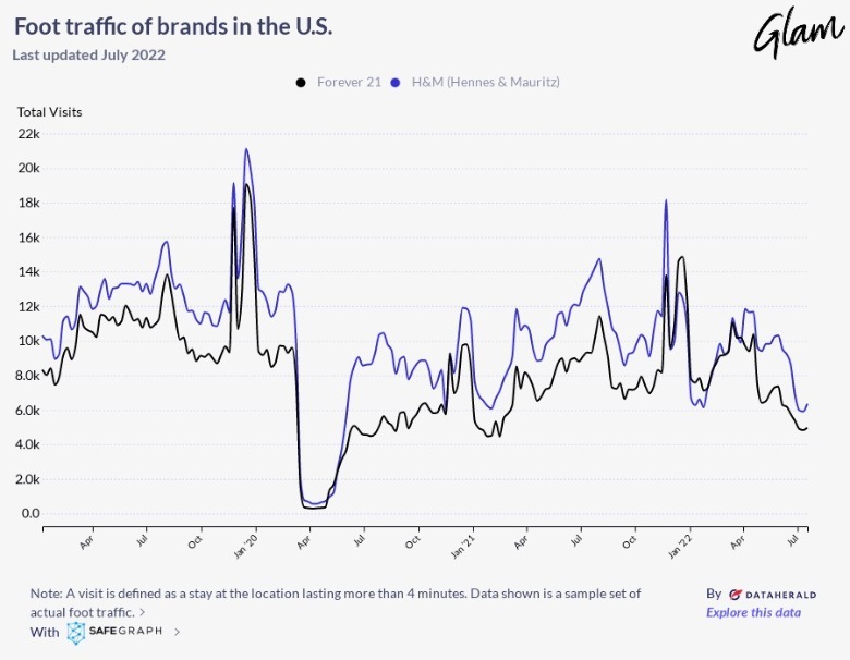 While H&M and Forever 21's foot traffic numbers seem closer during summer 2022, the former continues to best the latter. On July 11, 2022, H&M had 5,901 unqiue visits, while Forever 21 had 4,821. H&M's higher foot traffic scores are nothing new, and it looks like the retailer will continue to surpass Forever 21's numbers. We believe that H&M's greater in-person visitor count is, at least in part, a result of its also-greater social media following.
