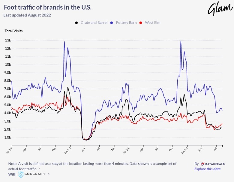 According to data collected by SafeGraph, Crate & Barrel, Pottery Barn, and West Elm all had high foot traffic scores in December 2021. On a single day in mid-December 2021, Crate & Barrel, Pottery Barn, and West Elm pulled in 6,317, 11,617, and 3,778 customers, respectively. But when we jump to April 2022, we notice a significant decline in foot traffic in the U.S. for all three stores. On a single day in early April 2022, Crate & Barrel pulled in 3,911 shoppers, Pottery Barn received 6,958 customers, and West Elm had 3,582 shoppers. Then, several months later on one day in August 2022, the numbers were even lower at 2,254 for Crate & Barrel, 4,317 for Pottery Barn, and 2,680 for West Elm.